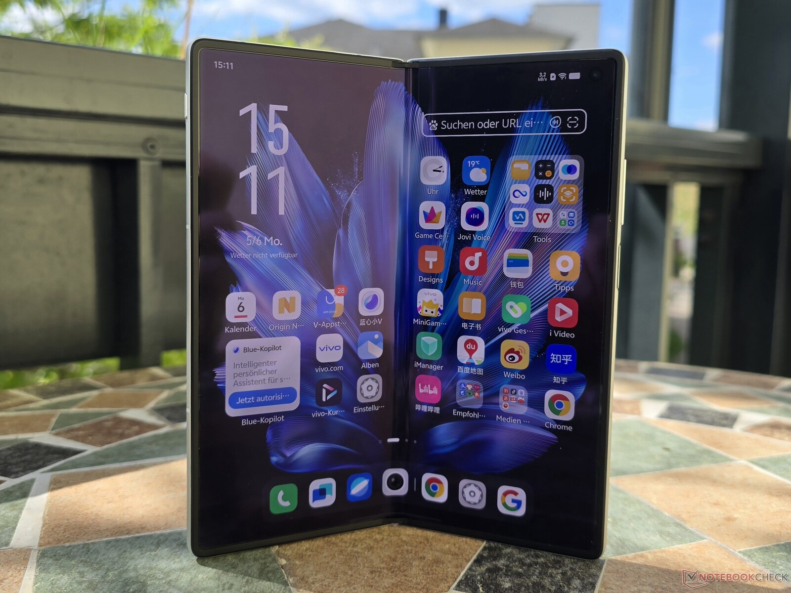 Som en klassisk vikbar smartphone finns det två skärmar som kan lysa riktigt starkt. Den flexibla AMOLED-panelen inuti mäter 8,03 tum i ett bildförhållande på 4:3,55. Vivo har lyckats se till att skärmvecken i mitten av skärmen knappt märks i vardagen och bara blir riktigt tydlig i reflektioner.