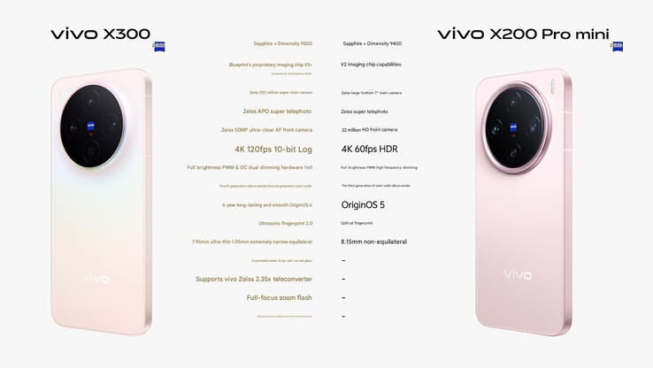 Vivo bekräftar själva att Vivo X300 inte är en direkt efterföljare till Vivo X200 utan snarare till Vivo X200 Pro Mini, eftersom ett officiellt specifikationsblad jämför den direkt med det tidigare flaggskeppet med kompakt Zeiss-kamera. I den här listan jämförs några viktiga specifikationer för den kompakta Pro Mini med den nya Vivo X300.