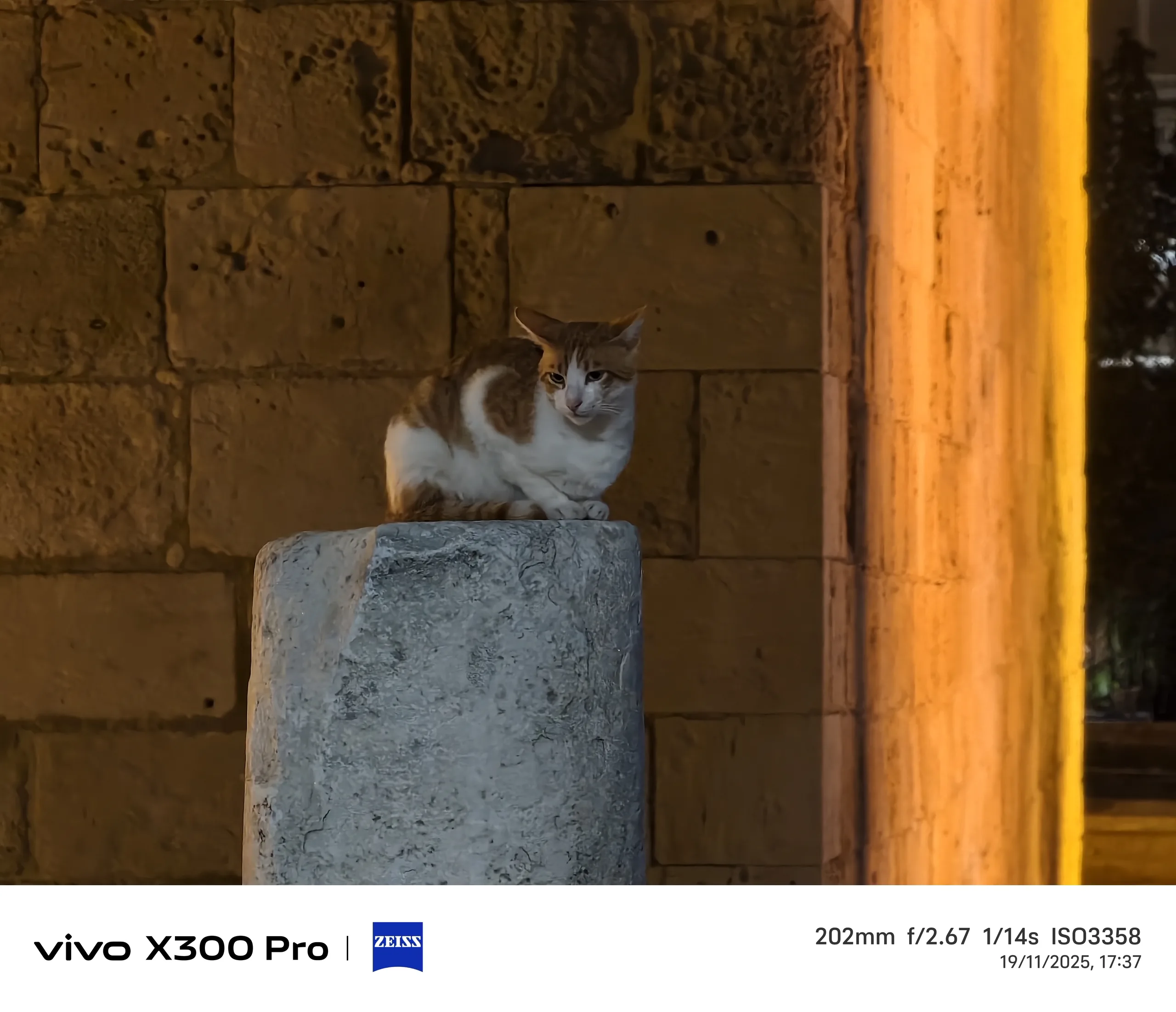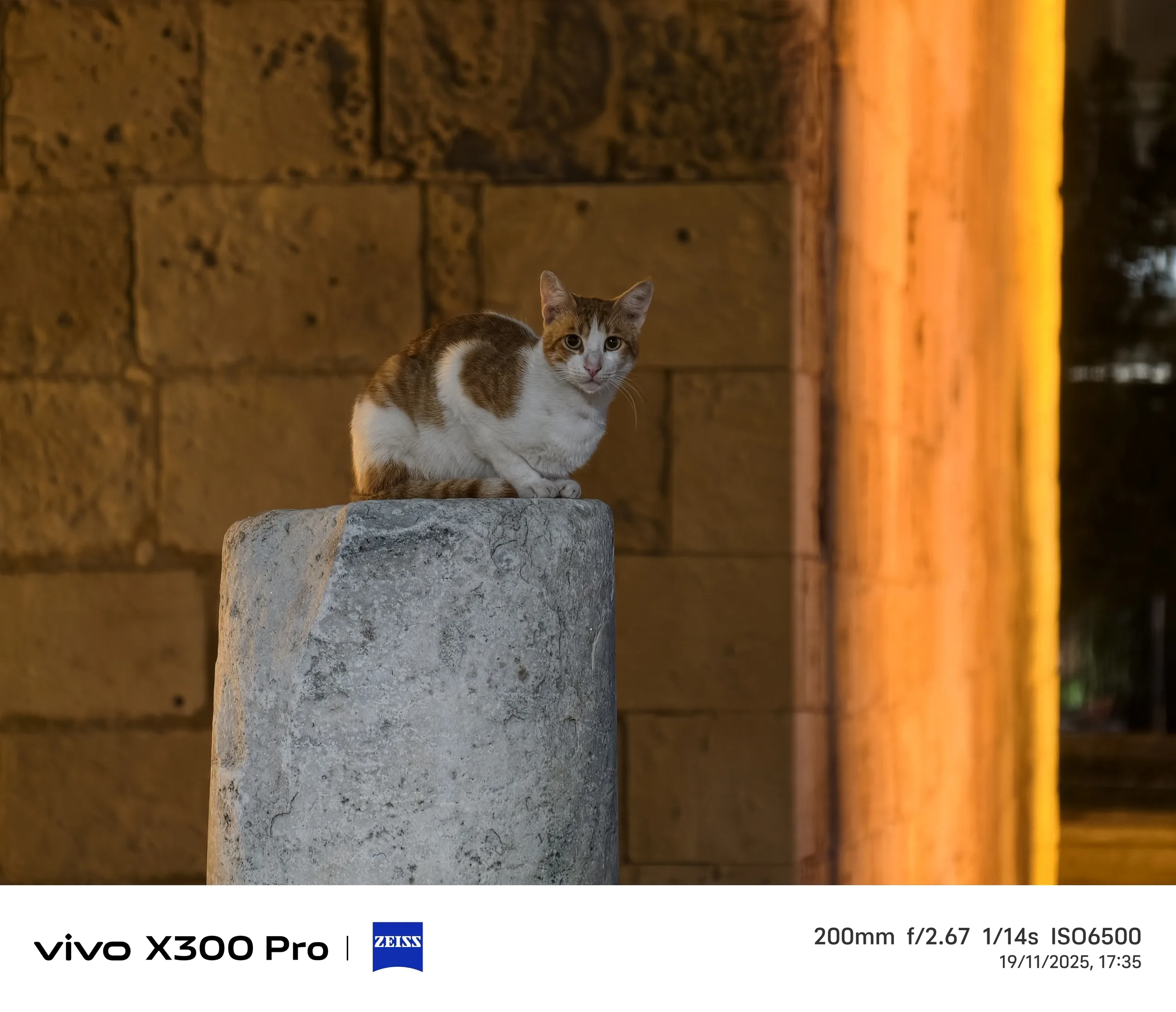 Jag hade förvånansvärt bättre erfarenheter av Vivo X300 Pros telekonverter i ännu mörkare situationer, troligen för att jag kunde stabilisera objektivet på räcket till Lemesos slott i Limassol för att fotografera katten som hade gjort sig hemmastadd på den gamla pelaren men tyvärr inte stannade kvar i samma position.