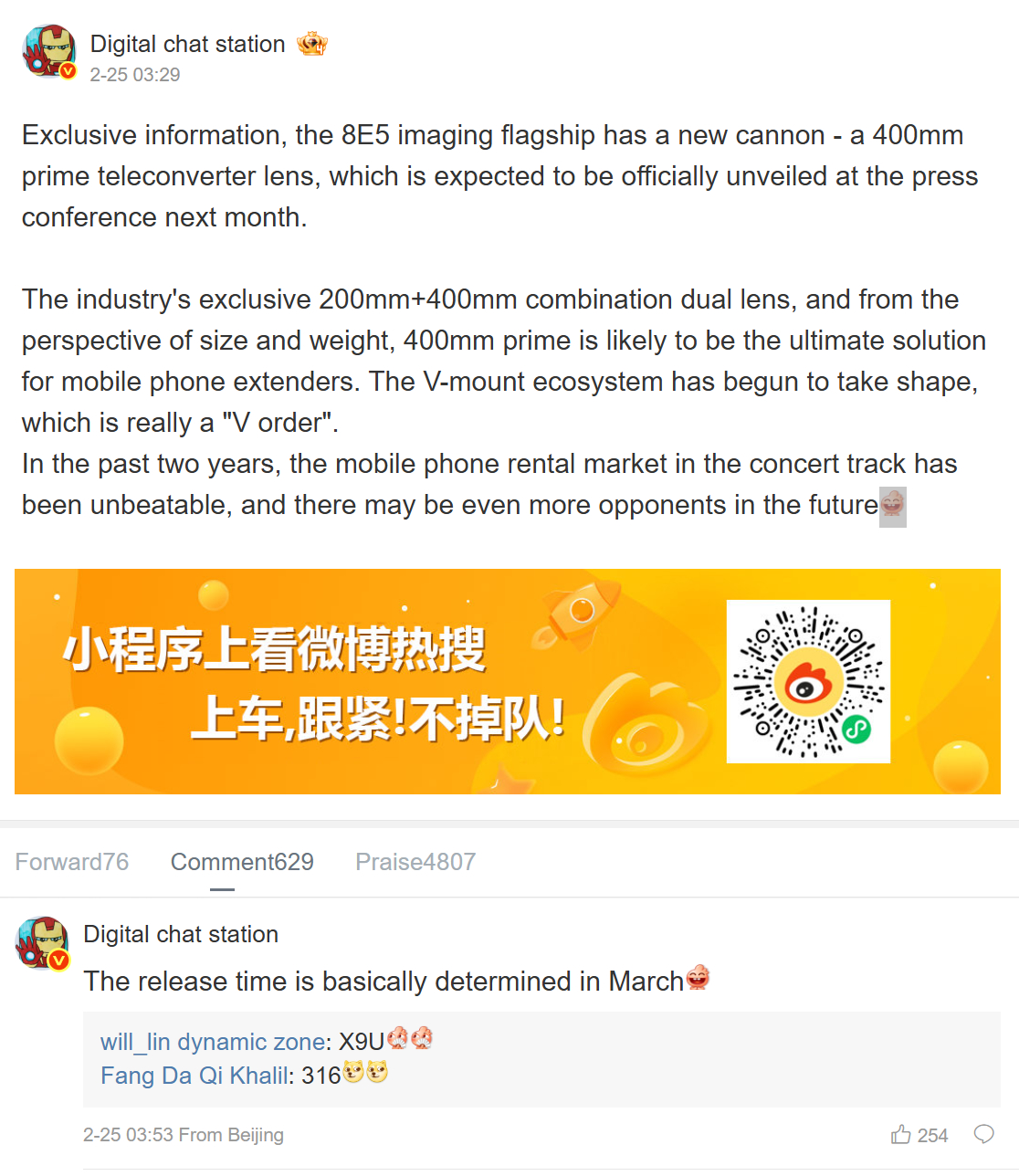 Dessutom har Digital Chat Station föreslagit att Vivo X300 Ultra också kommer att få sällskap av ett nytt telekonvertertillbehör som tar in två ekvivalenta brännvidder. På Weibo skriver läckan att tillbehöret kommer att stödja 200 mm och 400 mm lägen för att komplettera det förväntade 85 mm telefoto som ingår i X300 Ultra.