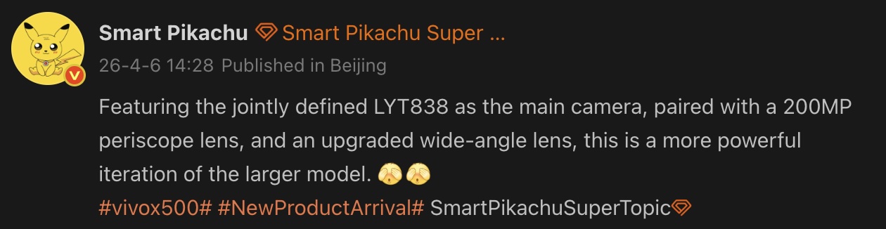 Vivo X300-serien är en flaggskeppskamera-fokuserad serie smartphones. Företaget introducerade nyligen två nya modeller i sortimentet: den Vivo X300s och Vivo X300 Ultra. Nu har en tipsare Smart Pikachu på Weibo delat med sig av kameraspecifikationerna för en kommande modell i Vivo X500-serien.