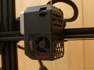 Extruderns drivhjul sitter endast ca 7 cm ovanför munstycket. På grund av den korta vägen kan även flexibla filament bearbetas. En radialfläkt säkerställer korrekt kylning av det extruderade materialet. Om så önskas kan det röda munstycket här också ersättas med egna konstruktioner.