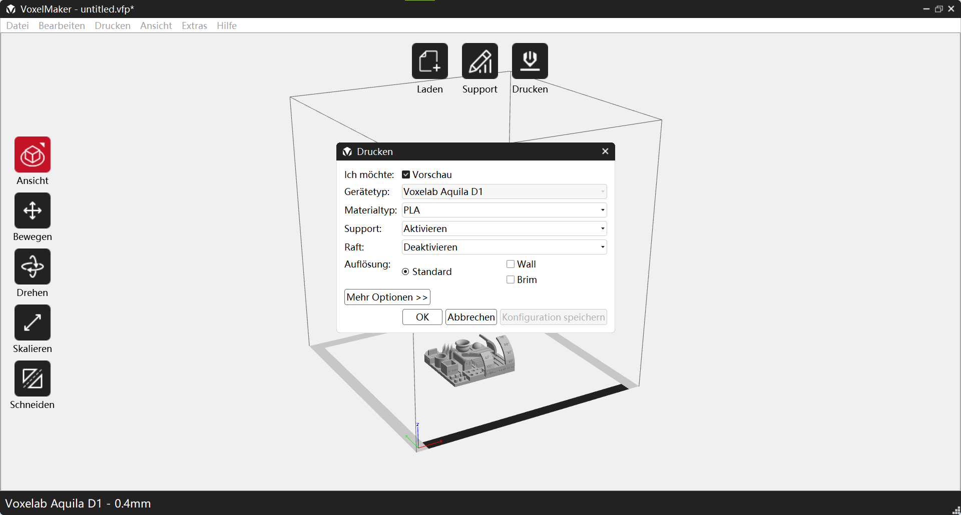 Bortsett från felen i den tyska översättningen är gränssnittet dock ganska bekvämt. Numeriska värden kan matas in via ett sifferfält och de vanliga kontrollalternativen finns tillgängliga. Endast en guide för manuell justering av utskriftsbädden och ett inställningsalternativ för extruderingsfaktorn är inte tillgängliga.