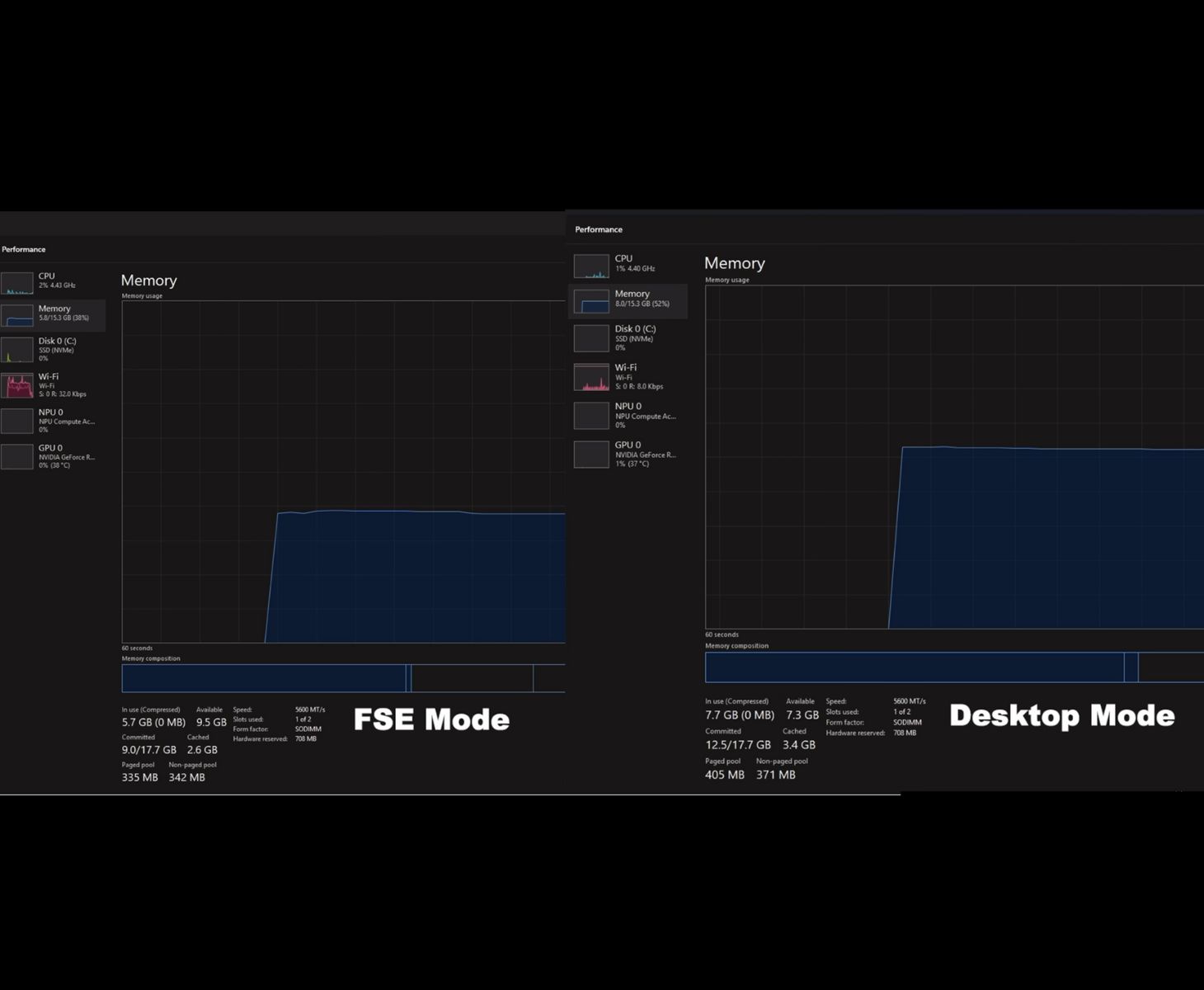 En anmärkningsvärd aspekt av FSE är dess förmåga att stänga av Windows standardskrivbordsmiljö, vilket minskar bakgrundsprocesserna och sänker den totala minnesanvändningen. I testerna som YouTubern visade, var en bärbar speldator utrustad med en Nvidia GeForce RTX 5050 använde cirka 5,7 GB RAM i FSE jämfört med 7,7 GB i vanligt skrivbordsläge, i linje med Microsofts påstående om cirka 2 GB sparade. Denna minskning kan vara till stor nytta för system med begränsat minne eller integrerade grafikkonfigurationer som förlitar sig på delat RAM-minne.