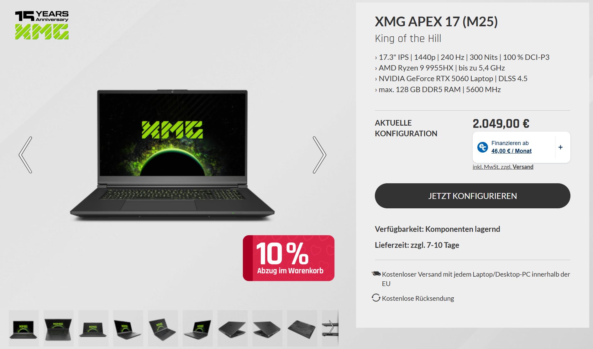 Prisökning för XMG Apex 17: RTX 5060 bärbar dator börjar nu på 2 049 euro