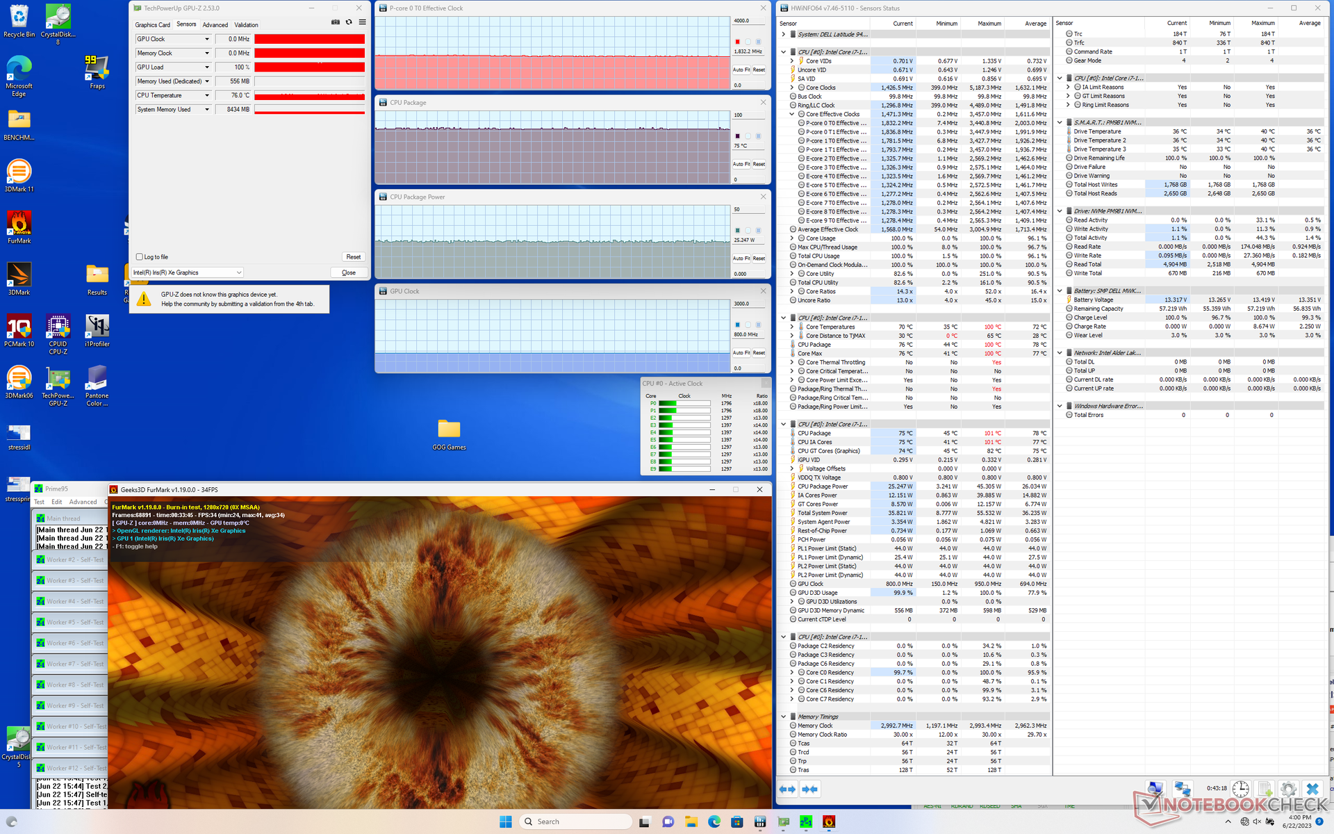 Processorn skulle öka till 3,5 GHz, 100 C och 45 W under Prime95-stress. På grund av den höga kärntemperaturen skulle dock klockfrekvenserna och kortets strömförbrukning snabbt och stadigt sjunka till 2,8 GHz respektive 30 W för att hålla en något svalare temperatur på 90 C. Genom att upprepa detta test på den konkurrerande ThinkPad X1 Yoga G8 skulle resultera i liknande höga kärntemperaturer. Subnotebooks som drivs av Core-U-processorer som vår Latitude -enhet förväntas inte upprätthålla höga Turbo Boost-klockfrekvenser under längre perioder.