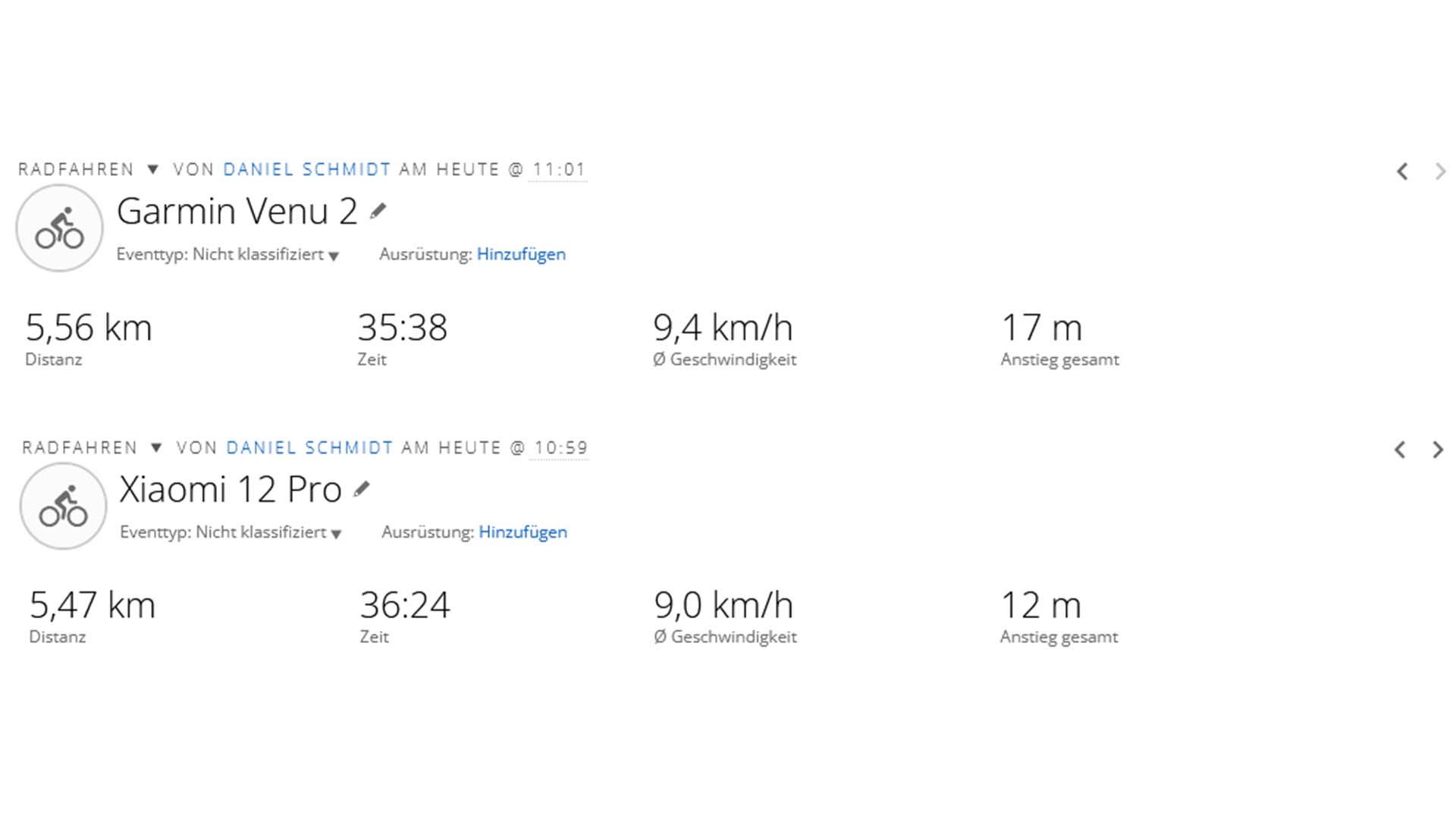 Xiaomis smartphone konkurrerar med Garmin Venu 2 smartklocka på vår lilla cykeltur. Endast 90 meter skiljer de två enheterna åt i slutet av vår testbana med en total längd på över 5 km. En närmare titt på spårets detaljerade förlopp visar att de ligger mycket nära varandra när de cirkulerar runt sjön med avvikelser på olika ställen från båda spårarna vid vändpunkten. För daglig användning bör 12 Pro ge mycket tillförlitliga navigeringsmöjligheter, samtidigt som den är väl lämpad för andra lokaliseringsuppgifter