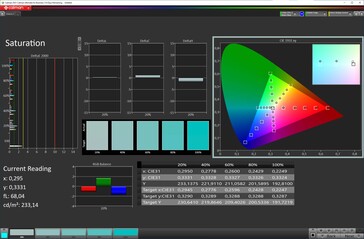 Vid visning av en rent vit bild når AMOLED-panelen upp till 959 nits i mitten. Med en jämn fördelning av ljusa och mörka områden som visas klättrar luminansen till mycket högre 1279 nits i APL50, 1356 nits i APL25 och 1377 nits i APL10. Detta placerar fortfarande Xiaomi under dess annonserade maximala ljusstyrka (1500 nits). Om man ställer in ljusstyrkan manuellt så är den maximala ljusstyrkan endast 479 nits.
