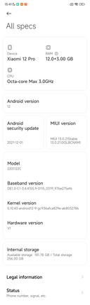 | 87.6 % v7 (old) | 02/2022 | Xiaomi 12 Pro SD 8 Gen 1, Adreno 730 | 204 g | 256 GB UFS 3.1 Flash | 6.73" | 3200x1440 | |