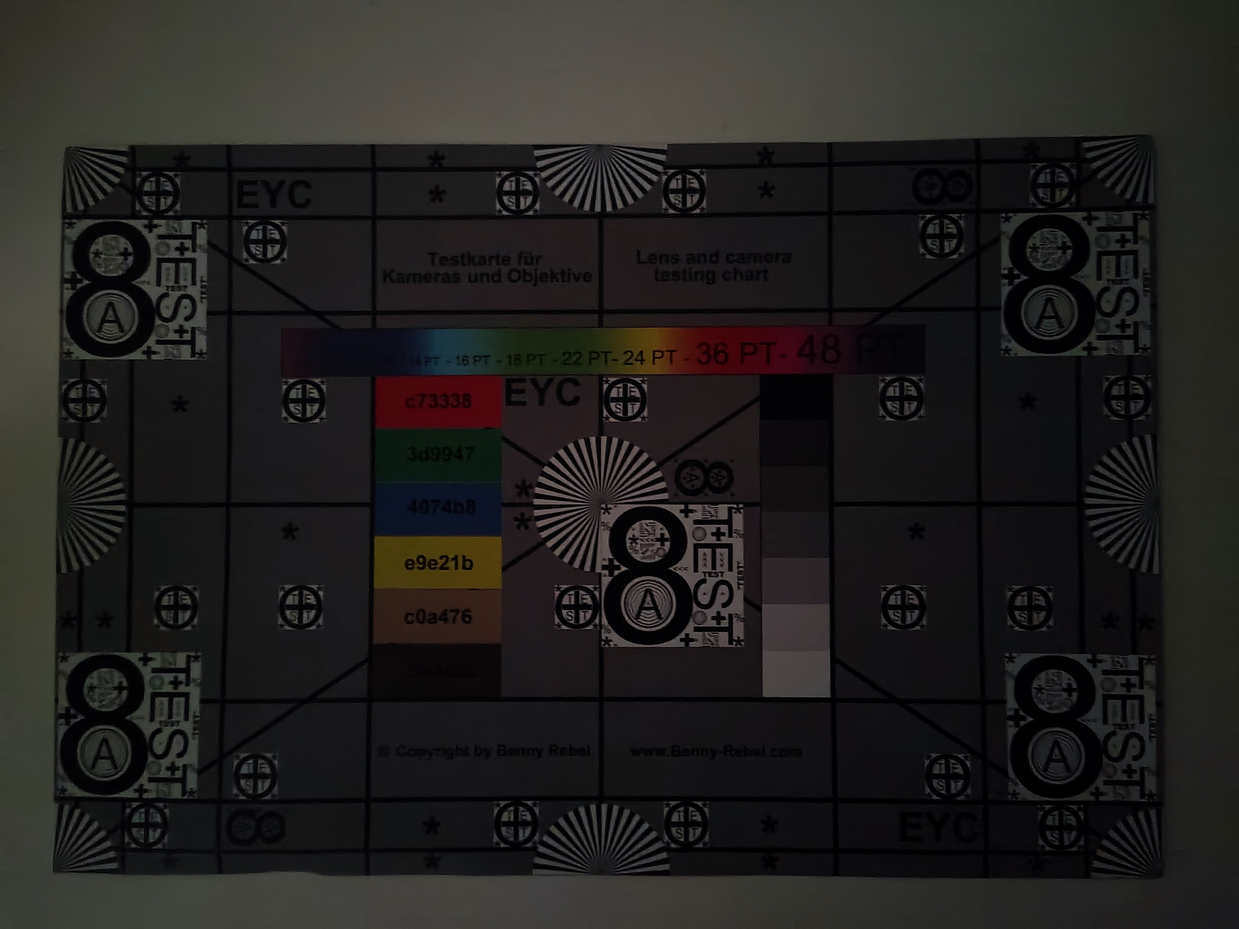 Daylight photo 1Daylight photo 2Ultra wide angle5x zoomLow lightUnder kontrollerade ljusförhållanden återger Sony IMX766 i Xiaomi 13 Lite färgerna på ett ganska realistiskt sätt. Sensorn kämpar dock med att korrekt fånga cyan, mörkare bruna och gröna toner. Huvudkameran återger testdiagrammet i detalj, men uppvisar fortfarande oskärpa mot bildens kanter. Å andra sidan är testdiagrammet fortfarande fullt synligt även vid 1 lux restljus.