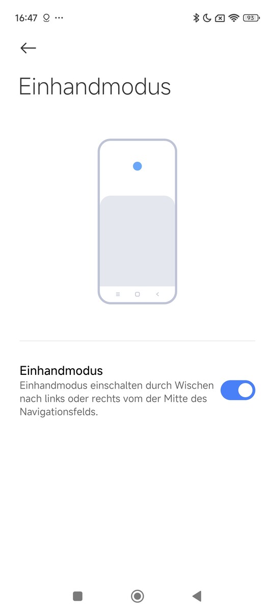 Om det behövs kan du aktivera ett enhandsläge. Dessutom kan strömknappen tilldelas ytterligare funktioner via telefonens inställningar. Dessutom har baksidan en beröringskänslig yta som reagerar på dubbla eller tredubbla tryck som aktiverar en tidigare bestämd funktion, till exempel att öppna kameraappen. Man måste trycka ganska hårt, men det fungerar även när mobilen sitter i sitt skyddsfodral.