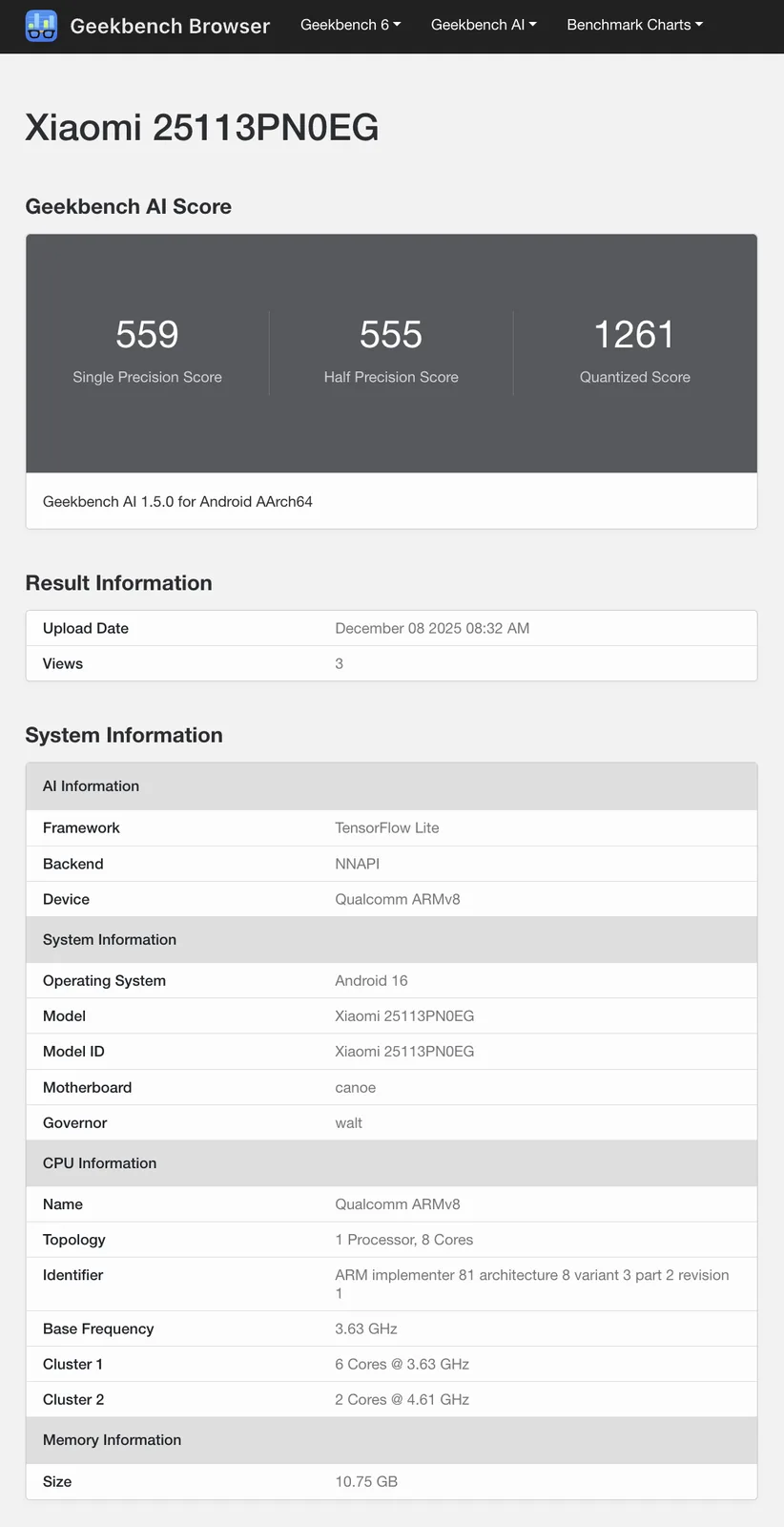 Specifikt har Xiaomi certifierat Xiaomi 17 för försäljning med National Broadcasting and Telecommunications Commission (NBTC) i Thailand. I slutändan länkar NBTC endast 25113PN0EG till Xiaomi 17. Detta globala modellnummer har dock dykt upp på Geekbench samtidigt. Från denna notering kan vi utläsa att den globala Xiaomi 17 kommer att ha den vanliga Snapdragon 8 Elite Gen 5 chipset, precis som dess kinesiska motsvarighet. Inte bara det, men Xiaomi 17 kommer att börja med 12 GB RAM internationellt också.