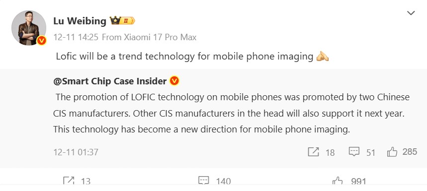 I ett -svar på ett Weibo-inläggbetonar Weibing att tekniken "Lateral Overflow Integration Capacitor" kommer att bli en trend för smartphonekameror, eftersom den är utformad för att leverera ett högt dynamiskt omfång i en enda exponering samtidigt som den förhindrar brus och LED-flimmer. Xiaomi-presidentens uttalande kan ses som en bekräftelse på att den nya 1-tums Omnivision OV50X-sensorn i Xiaomi 17 Ultra använder Lofic.