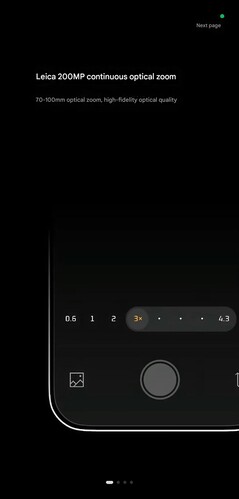 I bilderna nedan kan man förutom de vanliga zoomlägena 0,6x, 1x och 2x även se ett område mellan 3x zoom och 4,3x zoom, vilket verkar täcka brännvidder mellan 70mm och 100mm och kompletteras med ytterligare 8,6x zoom. Dessutom nämns specifikt en "Leica 200 MP kontinuerlig optisk zoom" och "high-fidelity optisk kvalitet", så Xiaomi erbjuder inte ett större zoomområde än på Xiaomi 15 Ultra, men uppenbarligen en zoom av högre kvalitet.