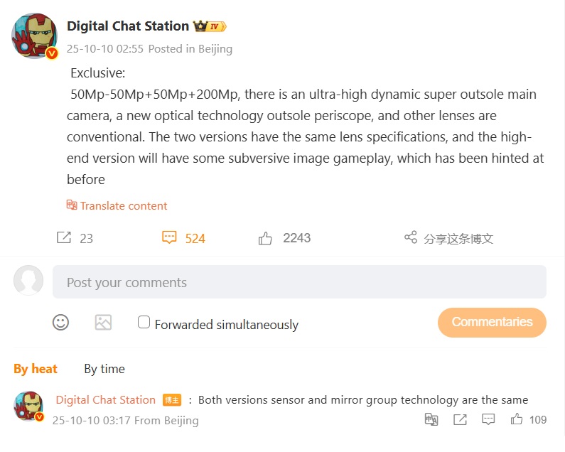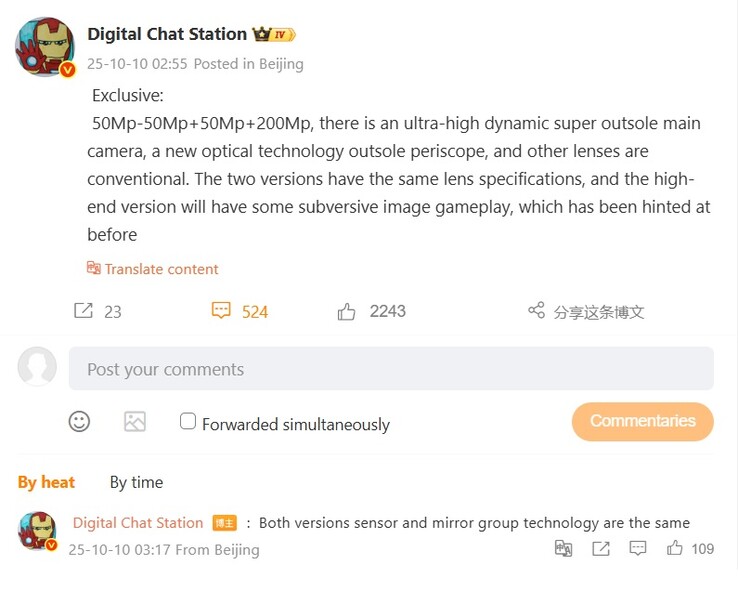 Det finns också andra spekulationer på Weibo, som har sammanfattats av X-användaren @Devinarde (se nedan). Förutom en optisk zoom på cirka 3-7x spekulerar vissa Weibo-användare också om ett sensorteam bestående av 1/1. 4-tums 200 MP ISOCELL HPE och 1/1.276-tums ISOCELL JN5, som uppenbarligen bildar en slags dubbel teleuppsättning med optik som kan fungera på liknande sätt som Huawei Pura 80 Ultra med dess rörliga skjutreglage, bara omvänt.