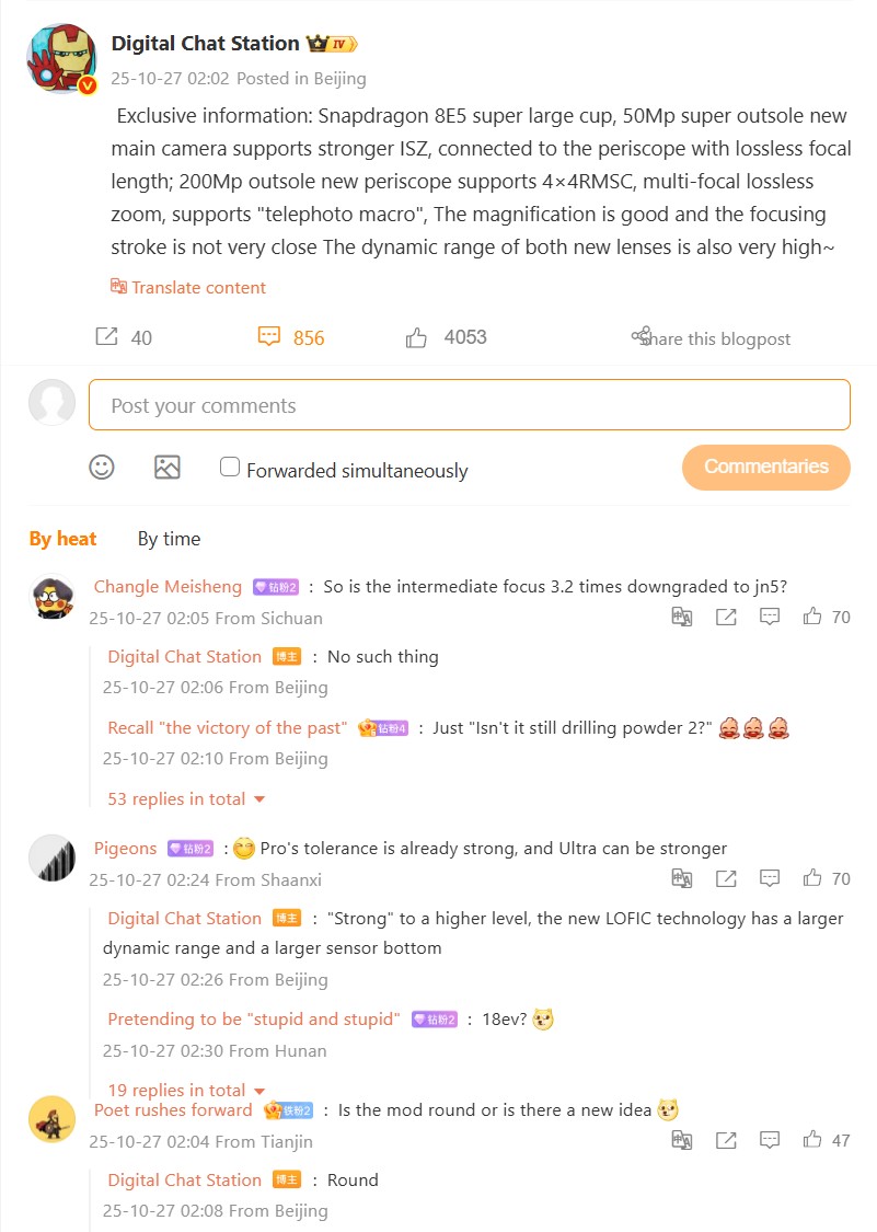 Detta kommer också att möjliggöra "starkare in-sensorzoom" på nära håll, vilket är tänkt att sömlöst överbrygga brännviddsområdet upp till periskop-telefoto. Baserat på en 200 MP-sensor (sannolikt Samsungs ISOCELL HPE) täcker detta flera zoombrännvidder med förlustfri crop zoom, där förstoringen beskrivs som bra och dynamiken hos båda sensorerna som mycket hög. Stöd för telefotomakro ingår också, enligt läckan. Precis som med Xiaomi 15 Ultra är Leica-kamerans design rund, så en andra skärm som den på Xiaomi 17 Pro är osannolik
