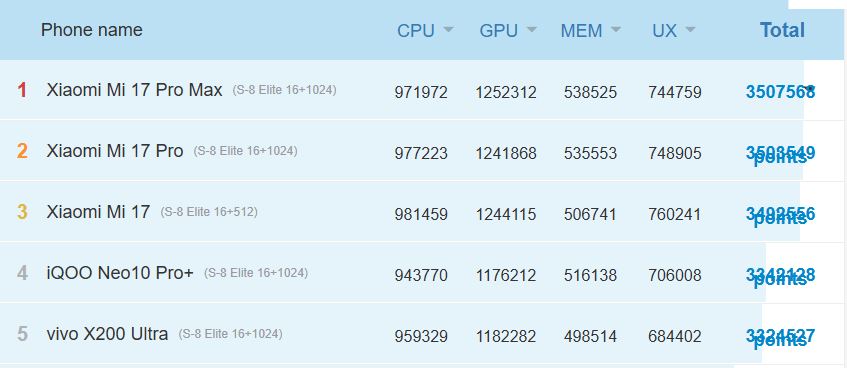AnTuTus senaste prestandadiagram belyser detta. Xiaomi 17 är listad med en CPU-poäng på 981 459 på det officiella diagrammet. Imponerande isolerat men bara cirka 3% högre än Vivo X200 Ultra förvaltar (959,329), trots att den telefonen drivs av förra årets Snapdragon 8 Elite. Både Xiaomi 17 Pro och Xiaomi 17 Pro Max får ännu lägre poäng än vanilj Xiaomi 17.