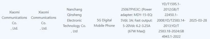 Tyvärr kommer dess trådbundna laddningsteknik inte att bli snabbare för att matcha, enligt en ny läcka. Den hävdar att Xiaomi har certifierat Civi 5 Pro som 25067PYE3C med samma 67W-specifikation som sin föregångare.
