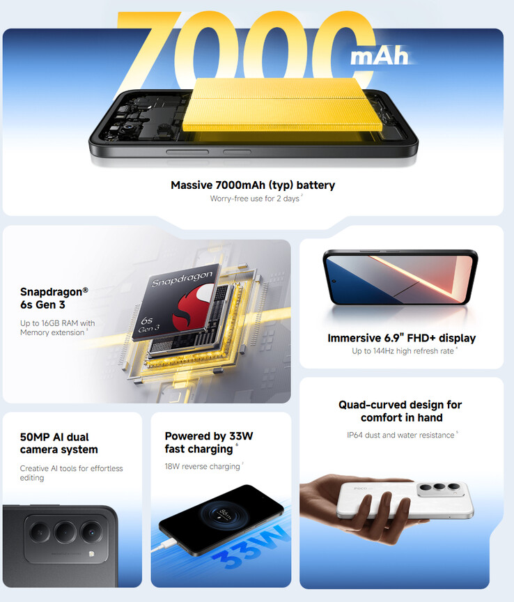 Kort sagt, Poco M8s är en ommärkt Redmi 15 (curr. 199 $ på Amazon). Som ett resultat har den nya smarttelefonen också en Snapdragon 6s Gen 3 chipset, ett 7 000 mAh batteri och en 50 MP primärkamera. Poco M8s har också en 144 Hz uppdateringsfrekvens över sin 1080p-skärm, samt 33 W trådbundet laddningsstöd för sitt stora batteri.
