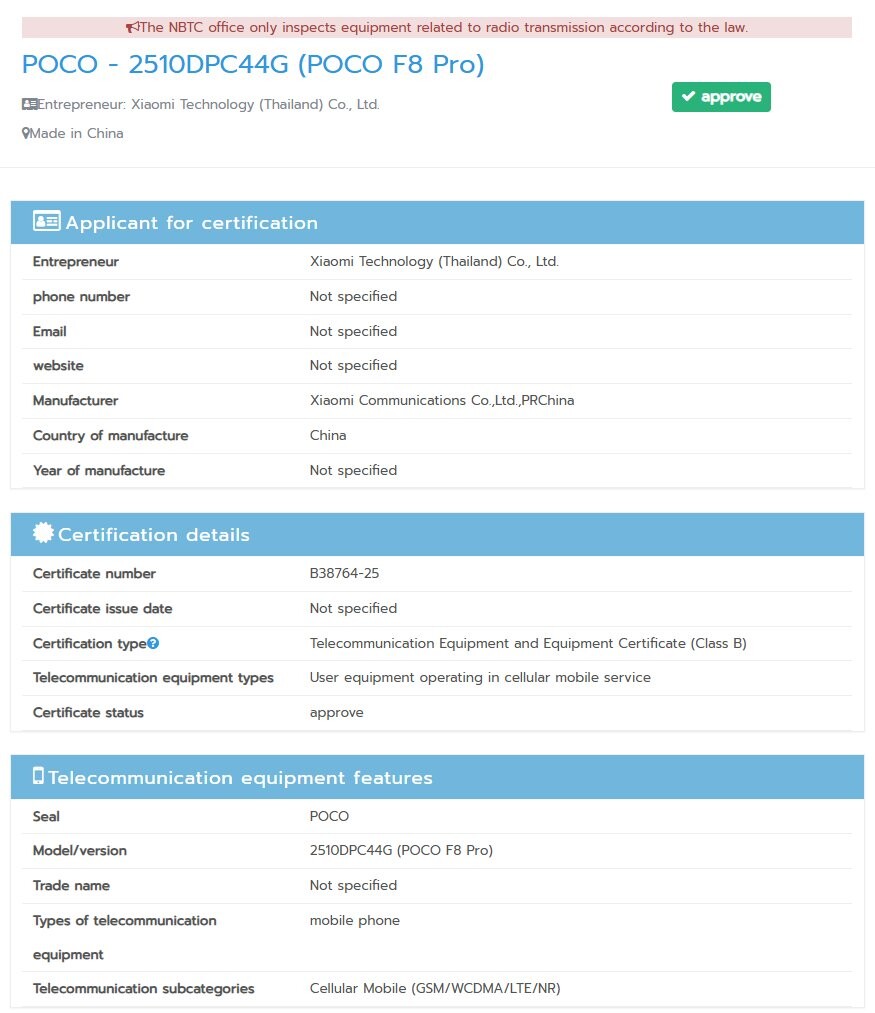 För närvarande har företaget inte avslöjat några detaljer officiellt. Men Poco F8 Pro:s existens har nu bekräftats genom en NBTC-certifiering (National Broadcasting and Telecommunications Commission) i Thailand. Certifieringen avslöjar inte några viktiga specifikationer för enheten. Den bekräftar dock att modellnumret "2510DPC44G" tillhör den globala Poco F8 Pro.