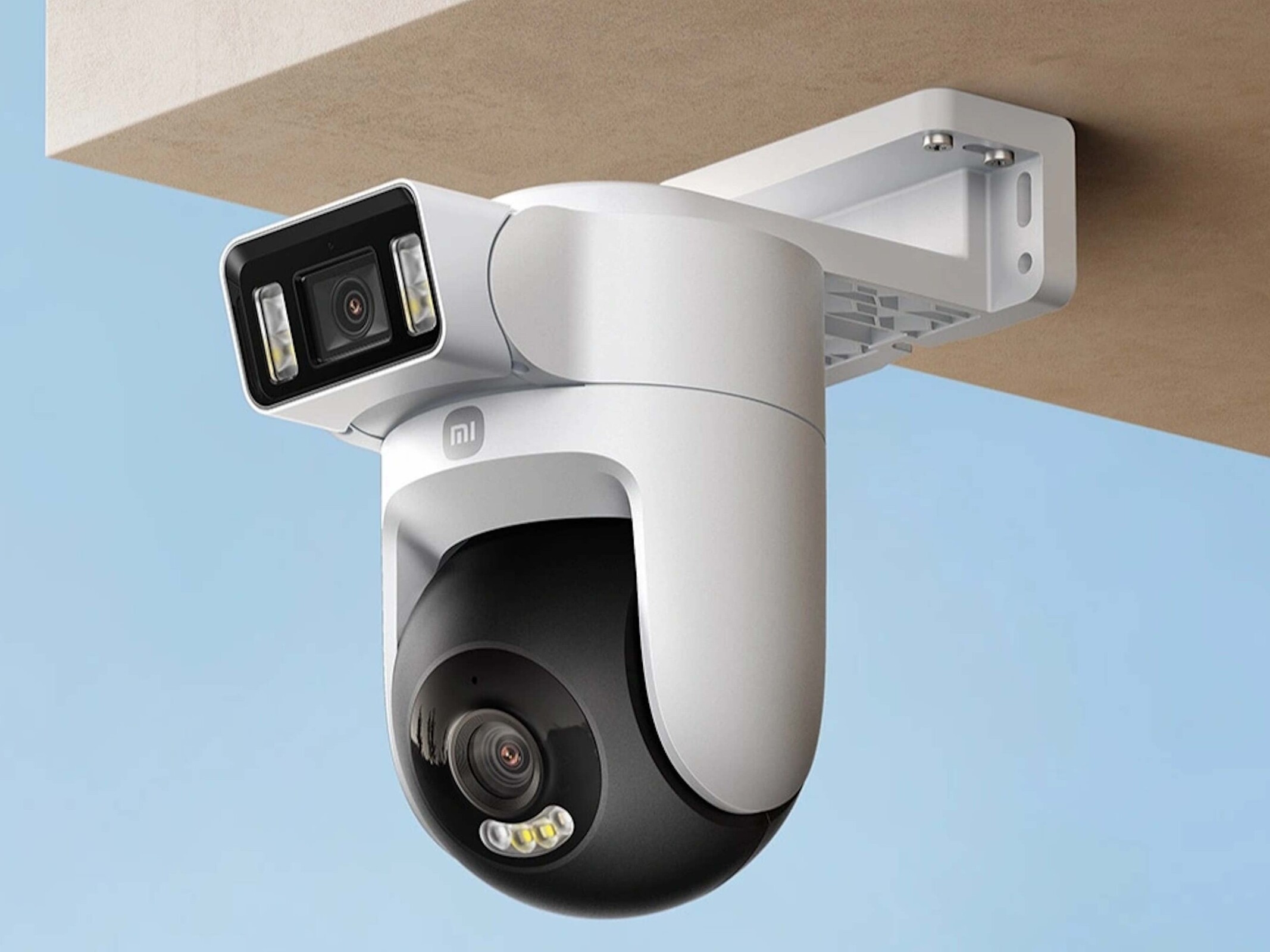 Den nya Xiaomi Smart Outdoor Camera har dubbla 5MP-kameror som tar bilder med 3K-upplösning (2 880 x 1 620 px). Den övre linsen är fixerad på plats, medan den nedre kan panorera, luta och zooma, så att du kan observera två områden samtidigt. Den här modellen erbjuder mörkerseende i fullfärg och kan använda AI för att upptäcka människor och fordon.