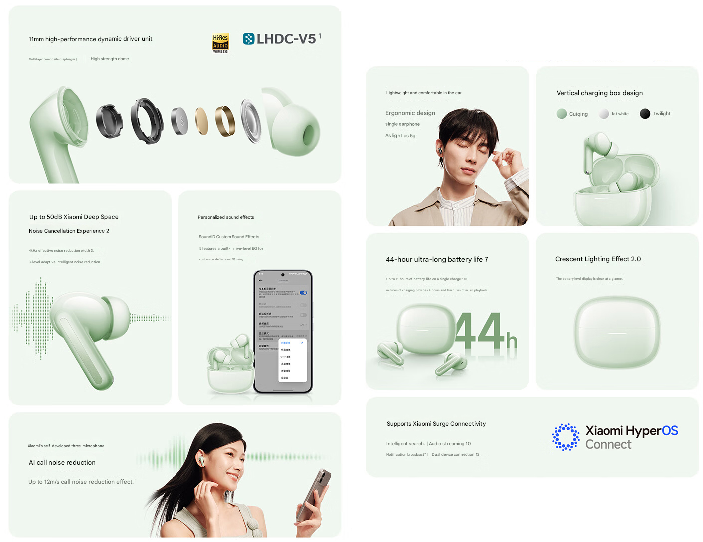 Det finns en ljudanpassningsfunktion som gör det möjligt för användare att skapa ett anpassat SoundID som matchar deras lyssningspreferenser. Xiaomi lovar också en tydlig samtalsupplevelse med de tre mikrofonerna, som är ihopkopplade med en AI-brusreduceringsalgoritm.