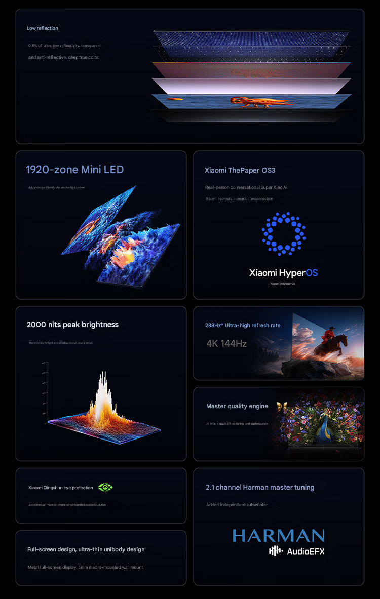 Den senaste EU-sortimentethar å andra sidan en maxstorlek på 98 tum, en maximal ljusstyrka på 1 200 nit och upp till 880 dimningszoner. Utöver dessa belyser Xiaomi de låga reflektionsegenskaperna hos den kinesiska S Mini LED TV 2026-serien. Det finns en "0,5% lågreflekterande film", vilket bör leda till en förbättrad tittarupplevelse under utmanande ljusförhållanden.