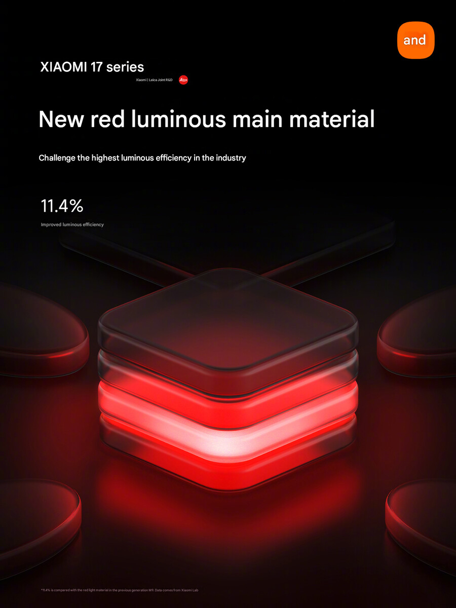 Med en separat teaser avslöjade Xiaomi att hela Xiaomi 17-serien kommer med den nya "M10 screen luminescence technology" Detta sägs göra att flaggskeppstelefonerna får en "världsledande ljuseffektivitet"