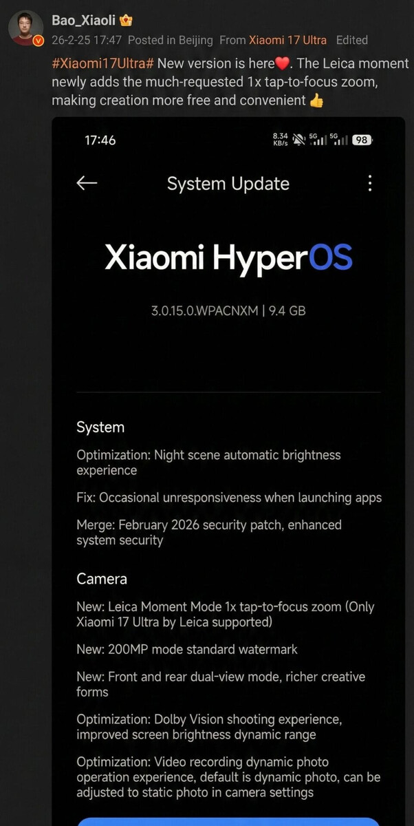 Företaget har inte glömt sina kinesiska fans ännu. Faktum är att Xiaomi har beslutat att föra över en funktion till Xiaomi 17 Ultra som tidigare var exklusivt tillgänglig på Leica Edition. Som skärmdumpen nedan visar innehåller den förstnämnda uppdateringen från februari 2026 mer än bara en obligatorisk säkerhetsuppdatering. Istället innehåller den flera optimeringar och nya funktioner, varav många fokuserar på att förbättra kameraupplevelsen.