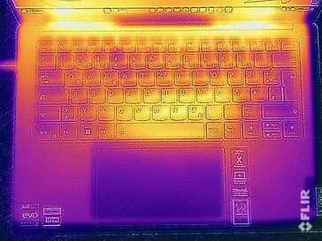 Det finns inga temperaturproblem under dagliga uppgifter, men Yoga Pro 9i 14 är en av de varmare enheterna i allmänhet och vissa fläckar är redan nära 30 °C under tomgång. Vi kan till och med mäta upp till 55 °C på undersidan under spel och hög arbetsbelastning, så du bör undvika hudkontakt. Tangentbordsområdet förblir mycket svalare med upp till 40 °C, så det är inga problem att skriva. Spelare kommer också att bli glada över de låga temperaturerna för WASD-tangenterna (33-35 °C).