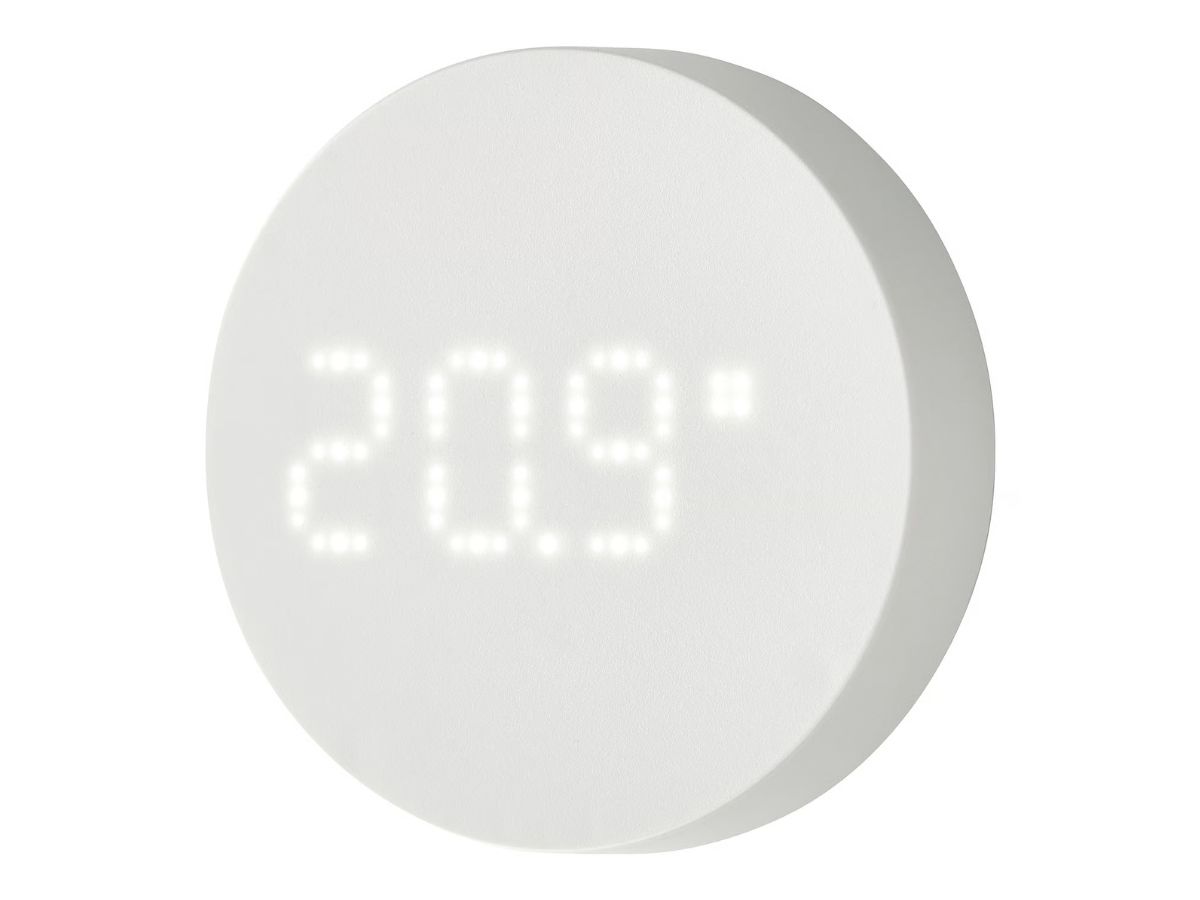 Timmerflotte är en rund enhet som kan monteras på en vägg eller placeras på en yta i det rum du väljer. Som produktens namn antyder kan den integrerade sensorn mäta temperatur och luftfuktighet, vilket visas på apparatens digitala display. Enligt produktlistan kan användaren växla mellan de två genom att klicka på en knapp.