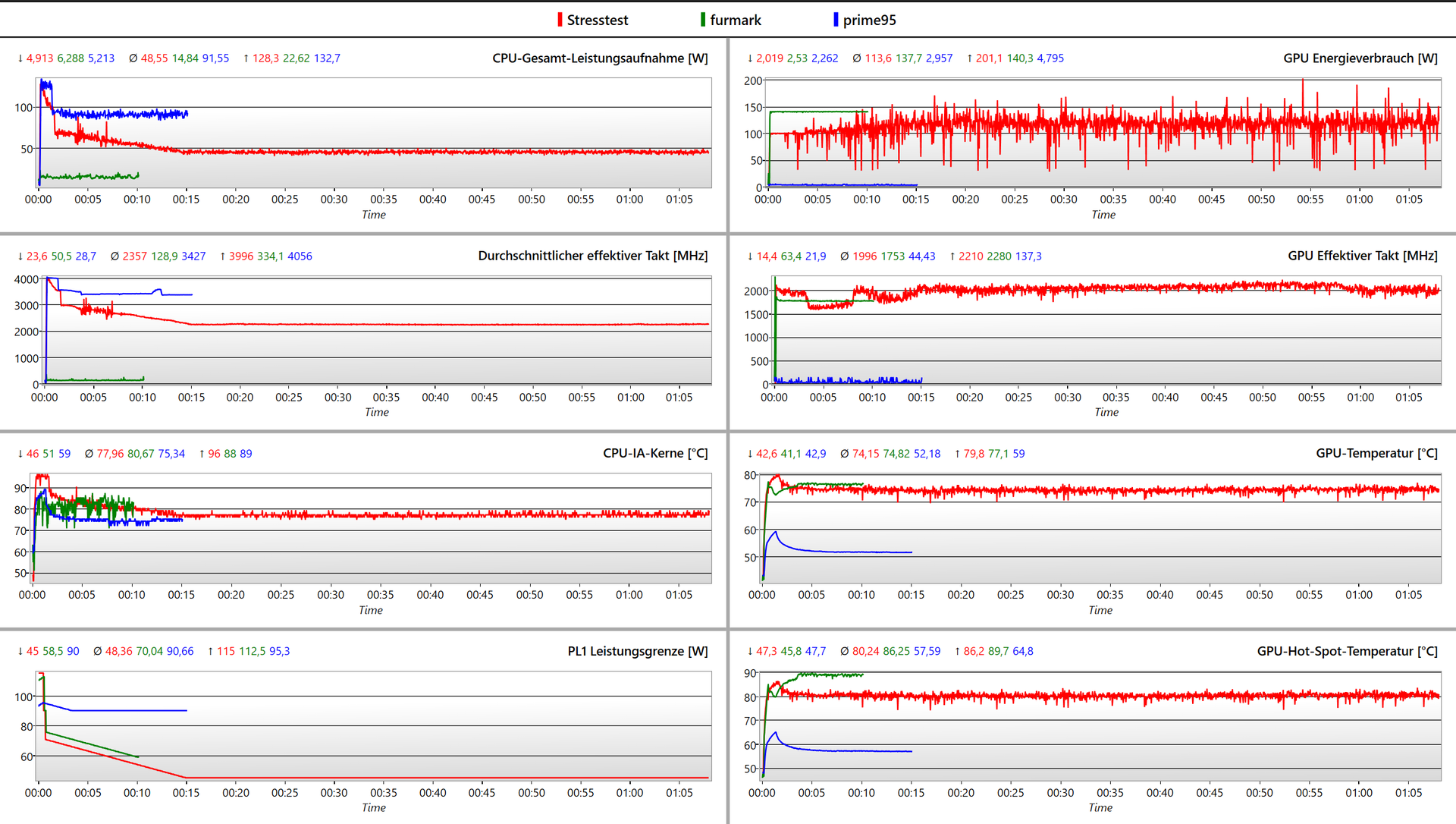 Medan en balans uppnås relativt snabbt i de individuella Prime95- eller Furmark-stresstesterna, flyttar Zenbook prestandan från CPU till GPU ganska långsamt i båda riktmärkena. DenIntel Core i9-13905Här i boost-läge i nästan två minuter. Enbart i Prime95 är detta cirka 125 watt; om Furmark också körs sjunker boost-effekten från 126 watt till 100 watt. I stresstest med båda programmen igång samtidigt uppnås en initial jämvikt efter två minuter med 70 watt för processorn och 100 watt för RTX 4080. Prestandan fortsätter dock att gradvis förändras under de kommande 12 minuterna, där CPU-prestandan sjunker med cirka 25 watt medan GPU-prestandan ökar till i genomsnitt 120 watt.