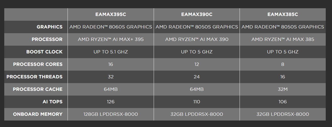 Högst upp i sortimentet finns Magnus EAMAX395C med Ryzen AI MAX+ 395 och 128 GB inbyggt LPDDR5X-8000-minne. Med 16 kärnor och 32 trådar, upp till 126 TOPS AI-prestanda och den integrerade GPU:n Radeon RX 8060S bör den här modellen erbjuda gott om utrymme för 1080p-spel och AI-arbetsbelastningar. Vi fann att Radeon RX 8060S iGPU levererade prestanda som liknar en GeForce RTX 4070 bärbar GPU i vår Asus ROG Flow Z13 recensionså användare bör inte ha några problem att köra de flesta spel vid 1080p här. Andra varianter inkluderar EAMAX390C med Ryzen AI MAX 390 och EAMAX385C med Ryzen AI MAX 385.