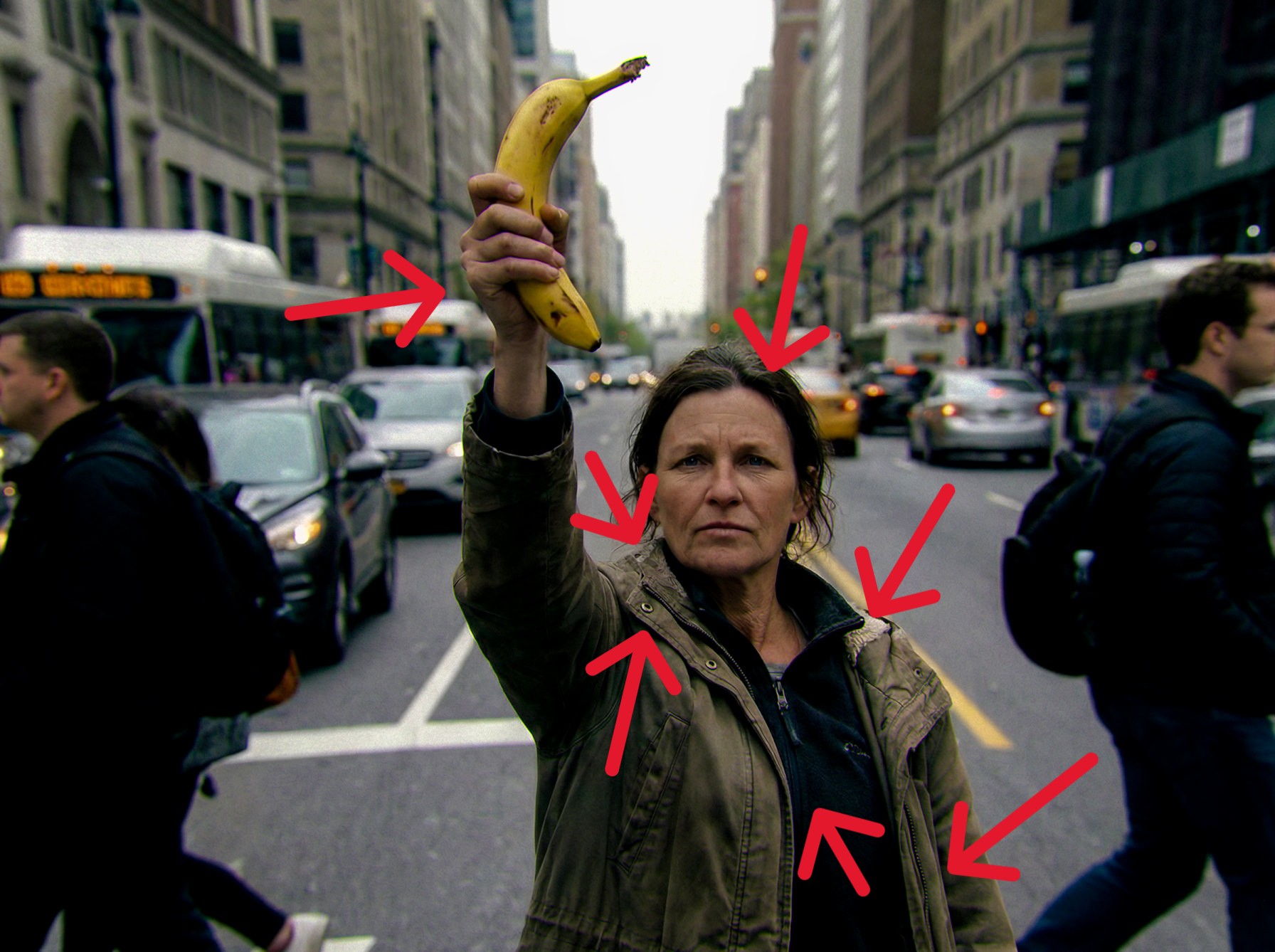 I den första delen av vår serie, körde vi bilden av kvinnan med bananen genom olika AI-bildigenkänningsverktyg. Efter en del bildredigering gav sex onlineplattformar tyvärr upp bilden och konstaterade att det inte var en AI-genererad bild. Det mänskliga ögat och lite sunt förnuft är till mycket större hjälp i det här fallet. Bilden avslöjar en hel rad punkter som tyder på AI. Den som fortfarande är skeptisk bör vara medveten om de problem som finns med generativ bildgenerering. Små detaljer återges ofta inte korrekt. Det gäller t.ex. texturer på tyger, smycken, stickade plagg, blixtlås och andra vanliga föremål. Däckmönster och fälgar på bilar och flygplan, träytor och hudrynkor tyder ofta på AI-bearbetning.