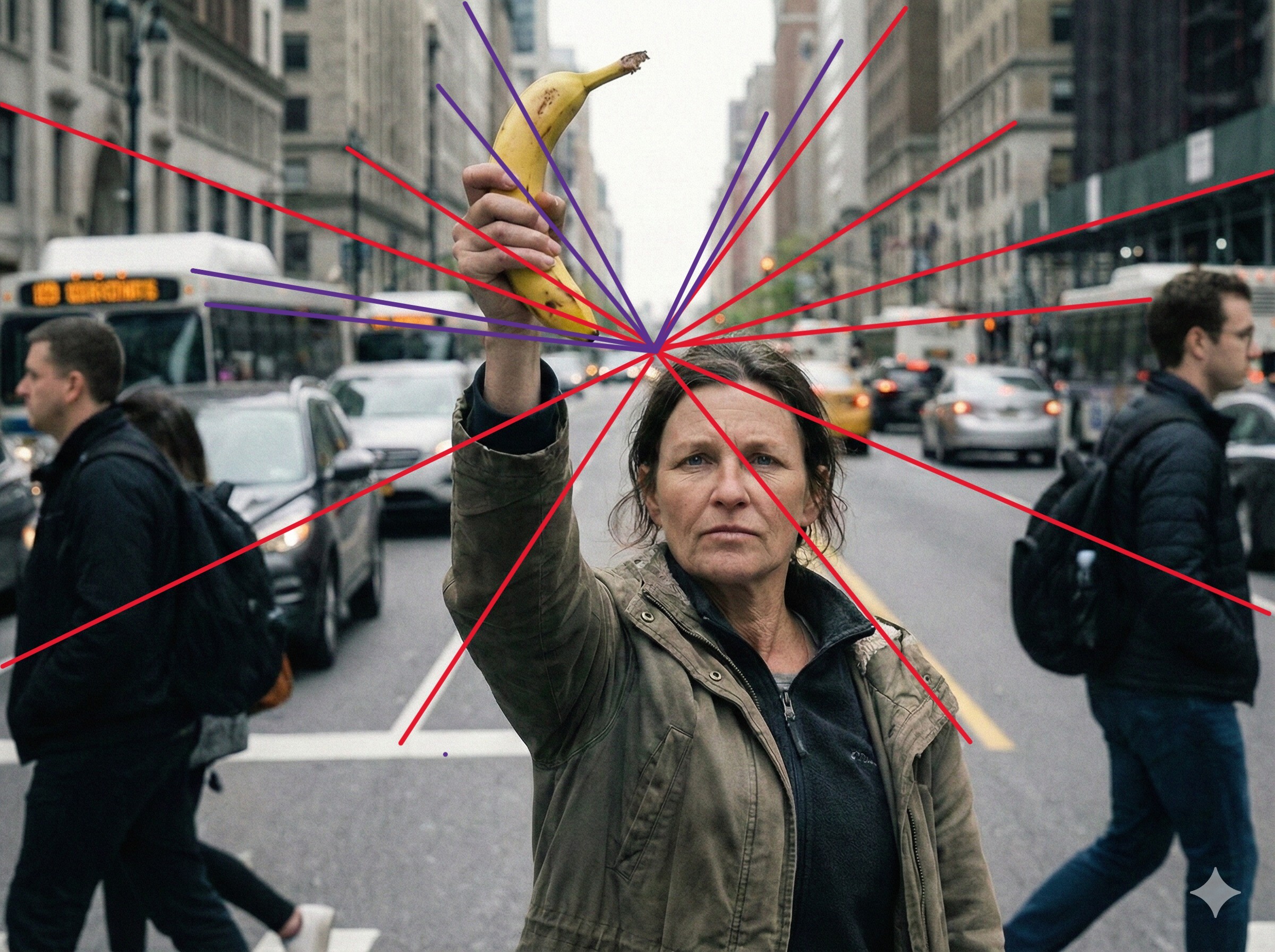 Djävulen finns också i detaljerna här. Gemini, eller snarare Nano Banana Pro, gör ett bra jobb med att återge perspektiv. Vid första anblicken syns bara en försvinnande punkt. En närmare titt avslöjar dock att trots oskärpan korsar vissa försvinnande punktlinjer våningar eller, i fallet med de två bussarna till vänster, helt enkelt försvinner i tomma intet. Vi färgade de linjer som vi ansåg vara inkonsekventa lila i bilden efter att ha fastställt perspektivets försvinnandepunkt