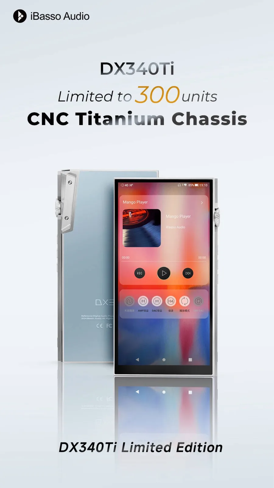 Flaggskeppsmusikspelaren iBasso DX340 levereras som standard med ett 486 gram tungt chassi i rostfritt stål, men i Titanium Limited Edition ersätts detta med CNC-fräst titan. Designen är ovanlig även utöver chassimaterialet: genom att lossa två skruvar på undersidan kan AMP15-förstärkarmodulen tas bort och ersättas med valfri iBasso AMP1x-modul.