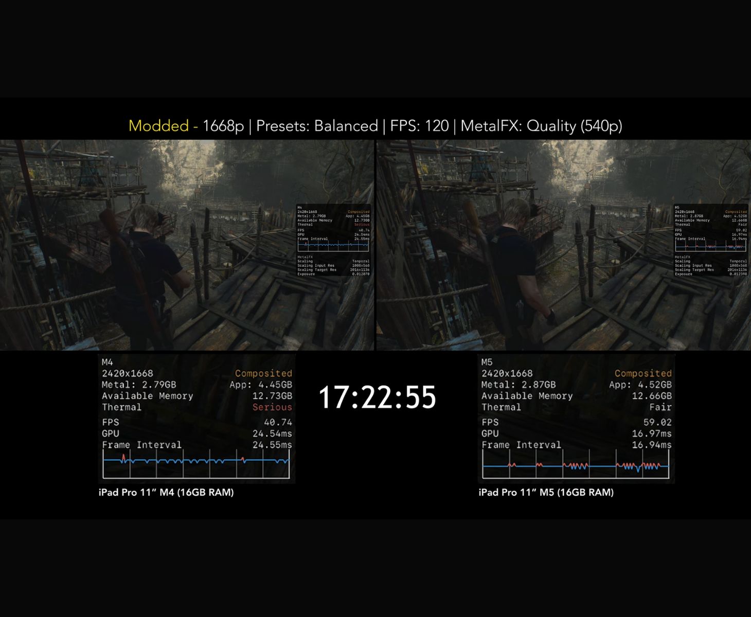 Spelet kördes med cirka 60 FPS när YouTubern ändrade konfigurationsfilerna, ställde in förinställningen till Balanserad, sänkte upplösningen, aktiverade MetalFX Quality-läget och ställde in FPS-målet till 120. Med dessa högre inställningar klarade M5 iPad Pro mellan 50-60 FPS. Samtidigt sjönk M4 iPad Pro till mitten av 40-talet, och M1 kämpade för att behålla ens 20 FPS.