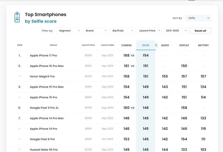 I en detaljerad analys från DxOMark visar det sig att uppgraderingen lönar sig. iPhone 17 Pro får 154 poäng i selfiekameran och intar därmed förstaplatsen på topplistan. Apple det nya flaggskeppet ligger före iPhone 16 Pro och Honor Magic6 Pro, som båda fick 151 poäng och nu ligger på andra plats, följt av iPhone 15 Pro med 149 poäng och Google Pixel 9 Pro XL med 148 poäng.
