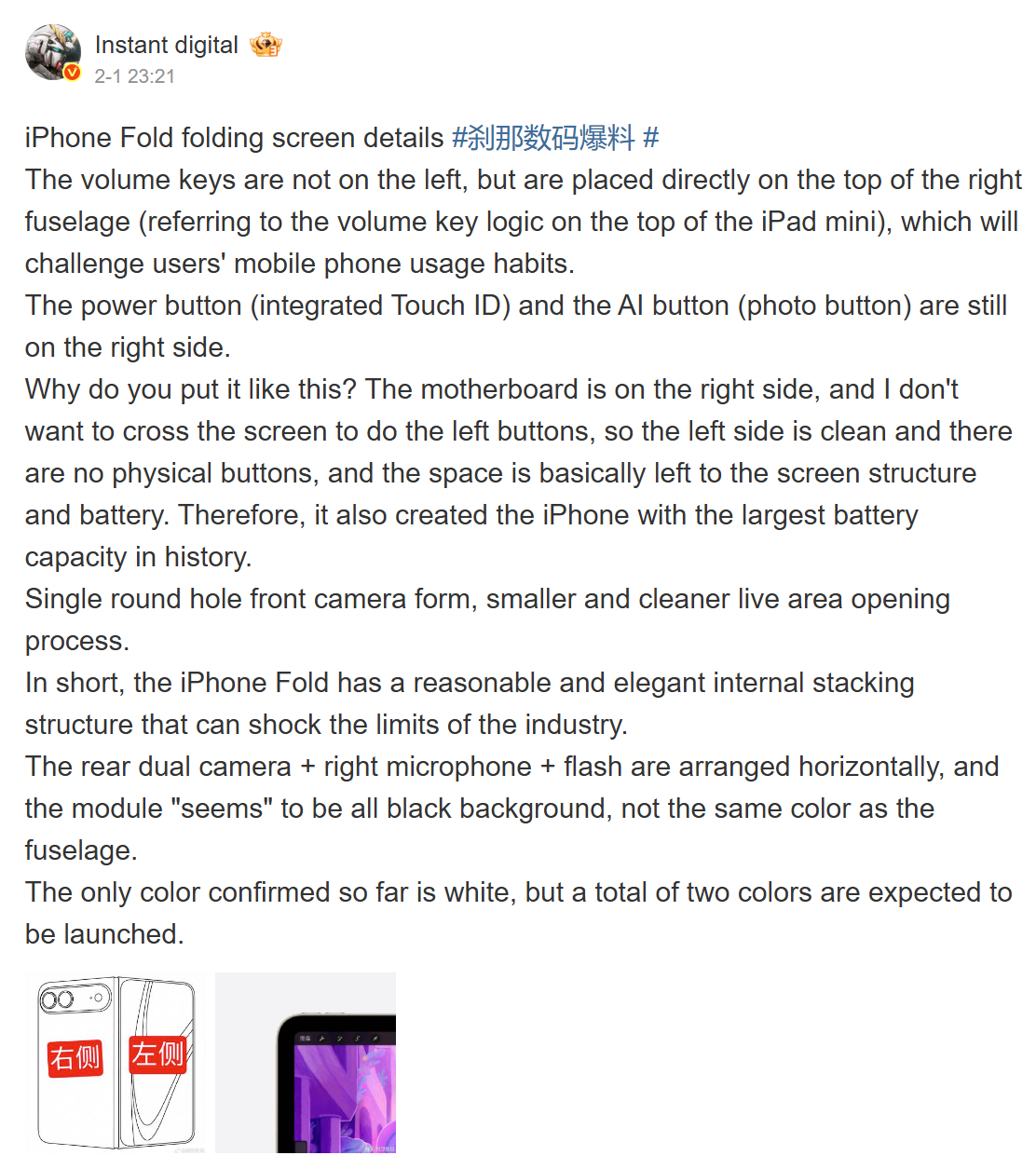Tydligen kommer iPhone Fold att efterlikna iPad mini genom att ha alla sina knappar på höger sida, inklusive en Touch ID-strömknapp. Ett staplat logikkort i denna halva sägs också eliminera behovet av överflödig kabeldragning. För närvarande förväntas Apple släppa iPhone Fold i två färgalternativ, även om endast ett vitt färgalternativ med en "helsvart" kameramodul påstås ha bekräftats hittills.