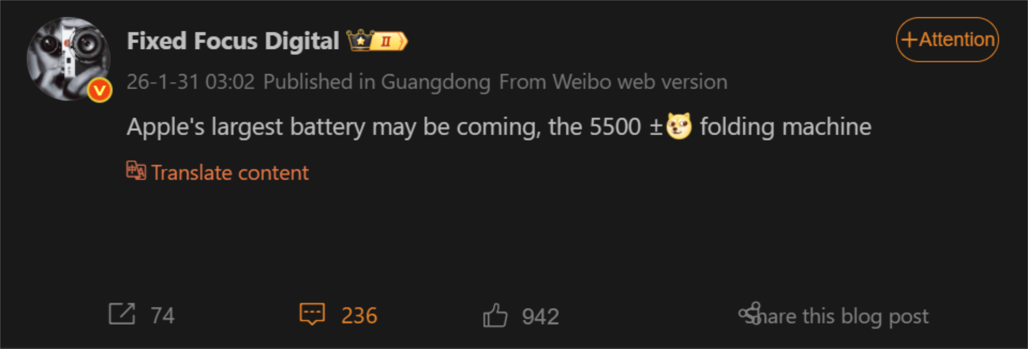 Till exempel informerade Fixed Focus Digital nyligen sina anhängare om att iPhone Fold kommer att levereras med det största batteriet på någon iPhone hittills. De skrev på Weibo och hävdade att iPhone Fold kommer att levereras med ett batteri på cirka 5 500 mAh.