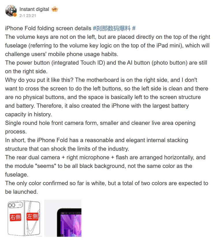 Med andra ord, Fixed Focus Digital föreslår att Apple's vikbara kommer att lanseras med 25% och 10% batterifördelar jämfört med Galaxy Z Fold7 och Pixel 10 Pro Foldrespektive (curr. $ 1 499 på Amazon). I ett senare inlägg upprepar Instant Digital Fixed Focus Digitals påstående och tillägger att avsaknaden av fysiska knappar på den vikbara mobilens vänstra sida har gjort det möjligt för Apple att maximera batterikapaciteten.