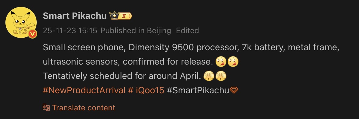 Den påstådda iQoo 15 Mini tippas ha en 6,3-tums skärm, jämfört med den större 6,85-tums skärmen på standard iQoo 15. Dessutom kan den använda Dimensity 9500 processor, även om en tidigare läcka pekade på den överklockade Dimensity 9500 Plus-chipsetet. Framför allt kan telefonen packa ett stort 7,000 mAh-batteri som liknar standardmodellen. Den kan också ha en metallram och en ultraljudsfingeravtrycksläsare.