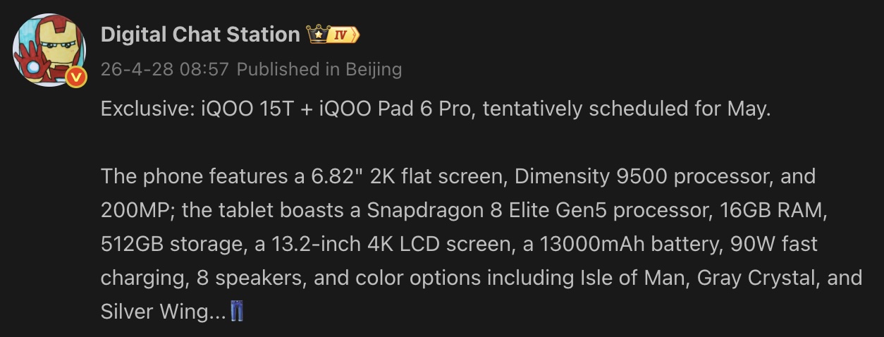 Tipsaren föreslår att iQoo Pad 6 Pro och iQoo 15T kan lanseras i maj i Kina. I separata nyheter, tidiga detaljer om nästa generations Vivo X500-serien har dykt upp.