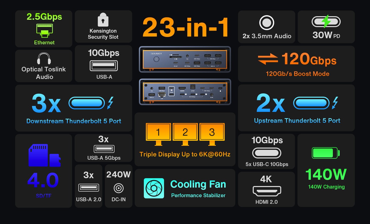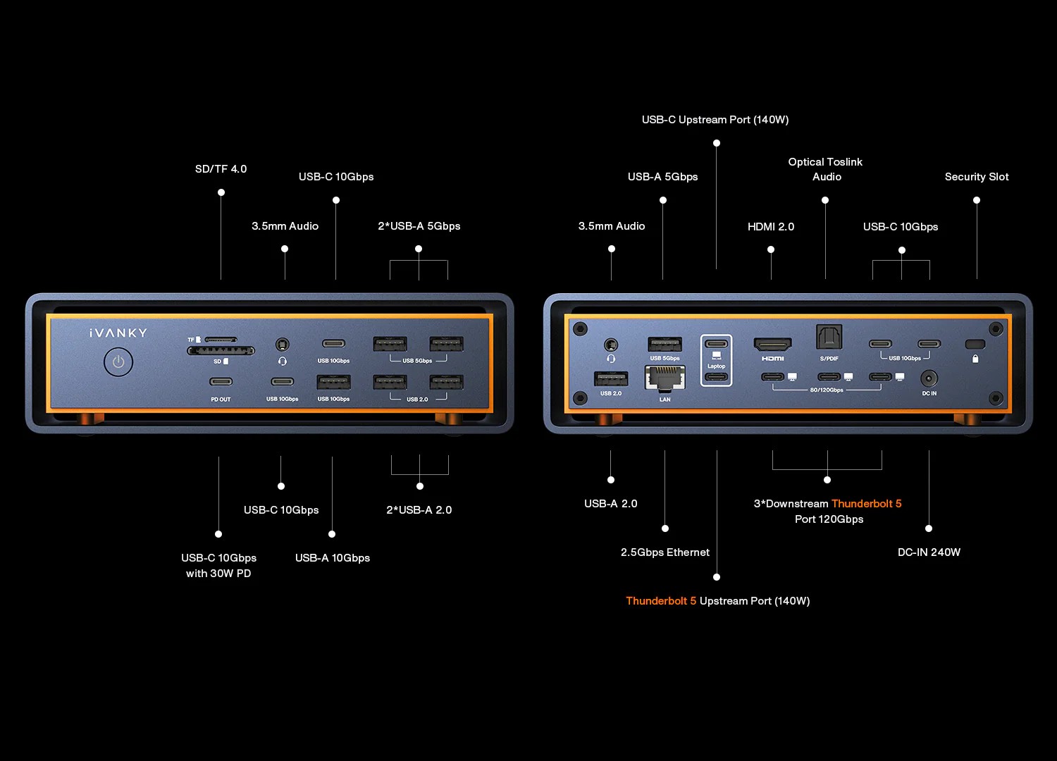 Till skillnad från de flesta Thunderbolt 5-dockor ansluts FusionDock Max 2 till värden med hjälp av två Thunderbolt 5-portar. I gengäld erbjuder den 23 portar med anslutningsmöjligheter, inklusive tre nedströms Thunderbolt 5-portar för externa skärmar, SSD-enheter och andra höghastighetsenheter. Den har också en HDMI 2.0-port, fem 10 Gbps USB-C-portar, en 10 Gbps USB-A-port, tre 5 Gbps USB-A-portar, tre USB 2.0-portar, dubbla 3,5 mm ljuduttag, optiskt ljud, en 2,5 Gbps LAN-port och SD/TF 4.0-platser.